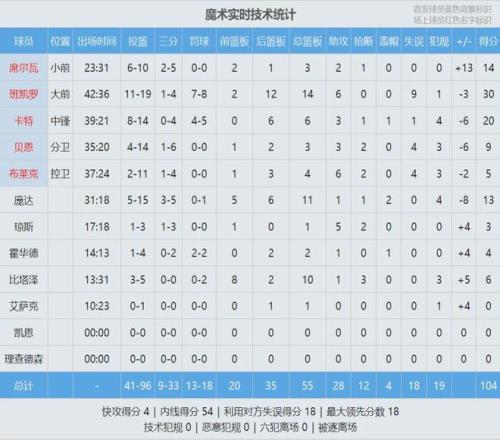 值得一提的是,這兩記三分都是打板命中的。班凱羅此役三分4中1,只進了這最后一個。今天班凱羅投籃19中11,三分球4中1,罰球8中7,砍下30分14籃板6助攻9失誤,正負值-3。本賽季班凱羅表現不佳,這次絕殺算是自我救贖!