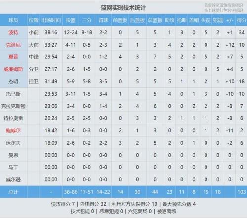 籃網這邊,小波特瘋狂出手18次三分球。全場比賽,小波特24投12中,三分18中8,罰球2中2,空砍34分5籃板1助攻3搶斷5失誤,正負值+1。小波特已經連續7場比賽得分20+,他也是籃網隊史最快命中100記三分的球員。