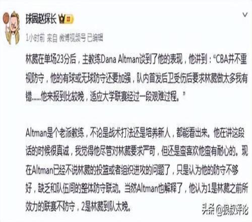 媒體人趙探長發文點評:Altman是個老派教練,不論是戰術打法還是培養新人,都能看出來。他在講這段話的時候很真誠,我覺得他盡管對林葳要求嚴苛,但還是蠻喜歡他蠻有耐心的?,F在Altman已經不說林葳的投籃或者組織進攻的問題了,只是認為他的防守不夠好,缺乏和隊伍間的整體防守聯動。當然Altman也解釋了,他認為1是林葳之前所效力的聯賽不防守,2是林葳到隊太晚。
