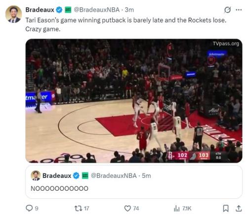 火箭記者曬出伊森補籃絕殺超時,寫道:NO!!!伊森的補籃絕殺超時了,他為了球隊的勝利付出一切,這場比賽太瘋狂了。
