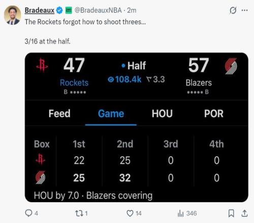 上半場打完火箭三分球16中3,這就是火箭上半場落后開拓者10分的關鍵,杜蘭特半場19分鐘,11中6,三分1中1,拿到16分2籃板0助攻3失誤,開拓者不斷反擊讓火箭首尾難兼顧,阿門、史密斯、謝潑德均發揮失常。