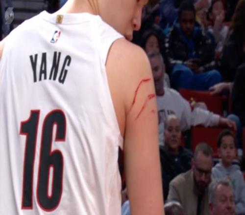 在第四節(jié),楊瀚森拼到個人5次犯規(guī)下場休息,可以清晰地看到他的肩膀有兩道血印子,還有血在滲出,絕對是 浴血奮戰(zhàn)。
