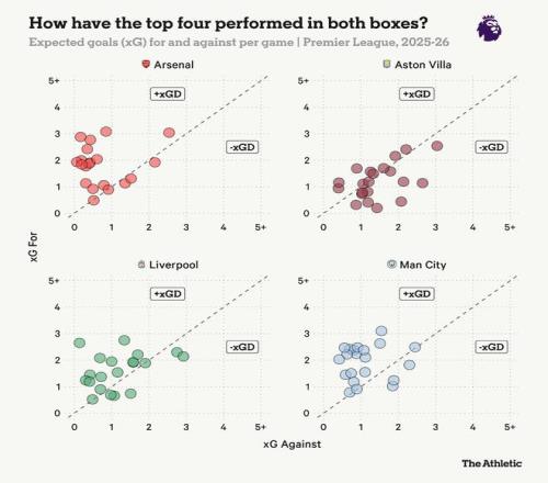 最具統治力的球隊會經常打出位于虛線上方的比賽——尤其是阿森納和曼城。維拉本賽季常常徘徊在虛線附近,這意味著他們的比賽結果常常取決于微小的差距。