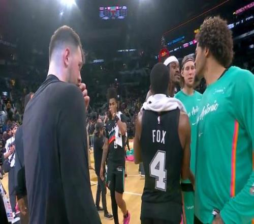 即便終場哨聲早已吹響,湖人和馬刺兩隊(duì)在弗羅斯特銀行中心球館的火藥味仍未消散。本場比賽湖人以91-107不敵馬刺,三連勝的勢頭被終結(jié)。當(dāng)兩隊(duì)球員陸續(xù)離場時(shí),湖人前鋒范德比爾特與馬刺前鋒索漢發(fā)生口角爭執(zhí),隨后范德比爾特伸手戳向索漢的面部,這一舉動(dòng)立刻引發(fā)馬刺前鋒朱利安?尚帕尼的不滿,后者直接上前將范德比爾特推開,雙方球員險(xiǎn)些因此爆發(fā)大規(guī)模斗毆。