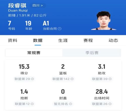 新賽季打到現(xiàn)在,段睿騏已經(jīng)有三場20+,分別是對上深圳以及兩戰(zhàn)青島拿到的。
