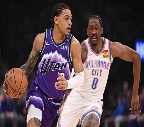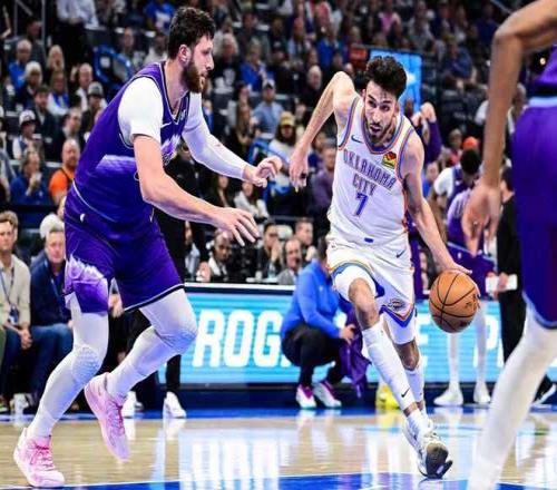 雷霆過去兩場連輸太陽與黃蜂遭遇2連敗,尤其是主場97-124慘負黃蜂,爵士過去4場遭遇4連敗,本賽季前兩次交鋒雷霆均客場大勝爵士。本場雷霆缺少哈爾滕施泰因、卡魯索與吉昂,爵士缺少樂福、尼昂與凱斯勒。首節前5分鐘雙方持續交替領先,雷霆在11-12落后情況下連得6分,雷霆之后維持25-20領先優勢。科利爾中投追分,雷霆一波6-0攻勢拉開比分,首節結束雷霆31-22領先爵士。首節雷霆20中11,其中三分8中3,亞歷山大4中3得到10+2+3;爵士被限制26中6,其中三分11中2。