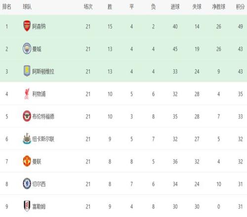 阿森納雖然只拿到一場平局,但依然占據了榜首位置。阿森納21輪狂攬49分排名第1,身后的曼城和阿斯頓維拉都是43分。也就是說,阿森納有6分的優勢,依然是奪冠最大熱門。而利物浦則落后有點多了,只拿到35分,排名第4。事實上,利物浦第4的位置并不穩,與身后的球隊差距很小。