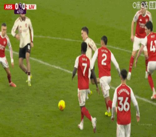 第44分鐘,阿森納前場圍攻,薩卡禁區內打門被擋