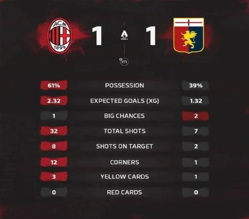 全場比賽結束,米蘭1-1熱那亞。