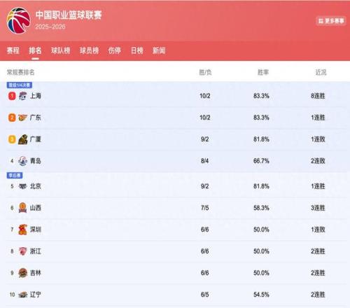 首先可以看一下前三的球隊,分別是上海隊、廣東隊以及廣廈隊。這三個球隊最近的表現非常的火熱。接下來如果說能夠把這個成績穩定下去,本賽季極有可能能夠成為爭冠的三強球隊。其中我們可以看到,廣東男籃雖然說目前是排在第二名,但是本賽季他們的目標其實是沖擊榜首,爭奪冠軍。
