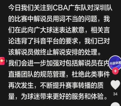 顯然,這就是這個(gè)解說在搞地域黑那一套,憤怒的廣東球迷馬上開始投訴,抖音也是在當(dāng)晚反應(yīng)迅速,立即解雇了這個(gè)解說,并且公開道歉。要知道,廣東的主場不僅僅有廣東人,還有很多從北方來打工的人,因此這個(gè)解說是把全國人民都罵了一遍,自然是要向廣大球迷進(jìn)行道歉。