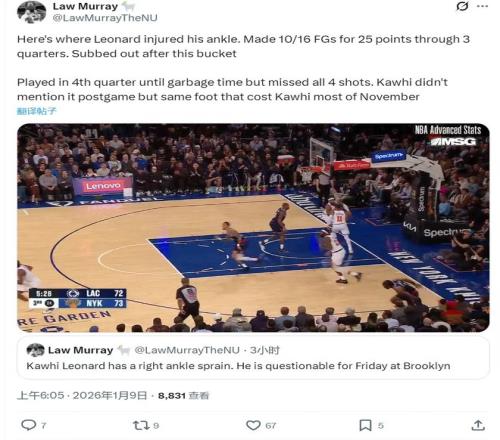 這次受傷的過程充滿了偶然與無奈。對陣尼克斯的第三節(jié),倫納德在一次底線跳投命中后,回防時(shí)不慎踩到了場邊一位球迷的腳,導(dǎo)致右腳踝再次扭傷。在他受傷退場前,僅僅兩節(jié)半的時(shí)間,他就已16投10中高效砍下25分,狀態(tài)火熱。盡管第四節(jié)他試圖帶傷堅(jiān)持,但明顯受到影響,4次出手全部偏出。這次意外的踩踏,不僅中斷了他個(gè)人的得分表演,更可能直接扭轉(zhuǎn)快船剛剛好轉(zhuǎn)的賽季軌跡。