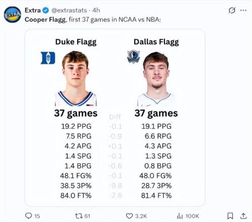 數(shù)據(jù)媒體曬出了弗拉格杜克大學(xué)前37場比賽與NBA前37場的數(shù)據(jù)對比,這個差距非常之效,NBA場均19.1分6.6籃板4.3助攻1.3搶斷0.8蓋帽,命中率48%,三分命中率28.7%。