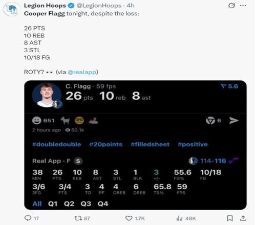 庫珀-弗拉格是獨行俠唯一的非賣品,他本場比賽的個人表現(xiàn)是非常出色的,全場比賽38分鐘,18中10,三分6中3,罰球4中3,拿到26分10籃板8助攻3搶斷1蓋帽,命中率55.6%,三分命中率50%,弗拉格的個人表現(xiàn)沒有受到外界的流言侵擾,因為不管球隊怎么變他都是未來的建隊基石。