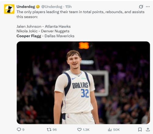 6.目前聯(lián)盟只有三人得分、籃板、助攻都是球隊最多:約基奇、杰倫-約翰遜、弗拉格;