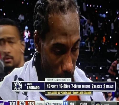 果不其然,這一回合打完后,泰倫盧立刻把他換下。第四節倫納德重新登場,表面上看還能打,但狀態已經開始出現問題: