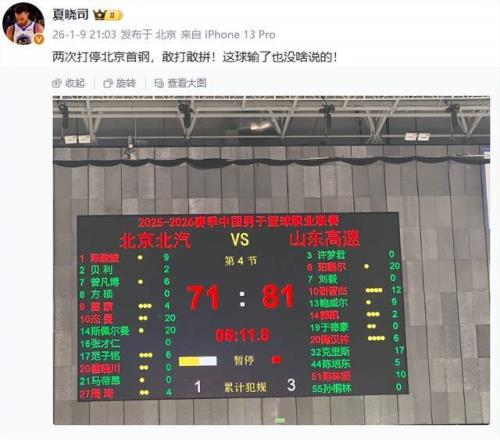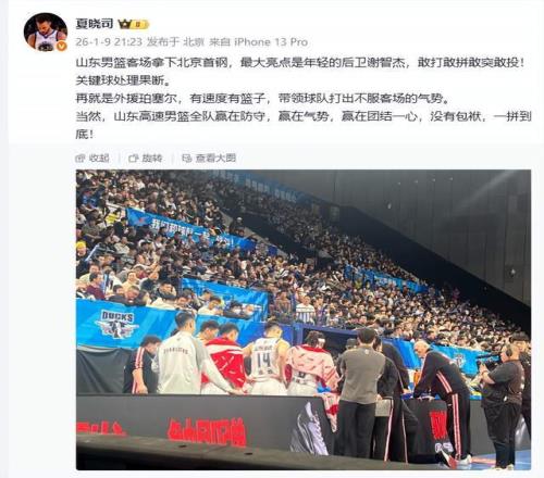 當山東男籃客場憑借珀賽爾絕殺北京隊之后,夏曉司老師是十分激動的,他在社交平臺寫道:“山東男籃客場拿下北京首鋼,最大亮點是年輕的后衛謝智杰,敢打敢拼敢突敢投!關鍵球處理果斷。再就是外援珀塞爾,有速度有籃子,帶領球隊打出不服客場的氣勢。當然,山東高速男籃全隊贏在防守,贏在氣勢,贏在團結一心,沒有包袱,一拼到底! ”