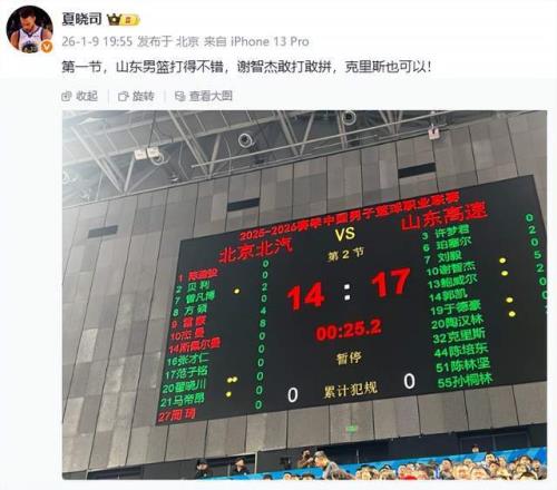 在第一節比賽打完之后,山東男籃17-14反超,夏曉司老師就忍不住了,直接發聲,“第一節,山東男籃打得不錯,謝智杰敢打敢拼,克里斯也可以!”