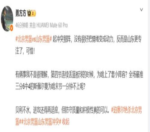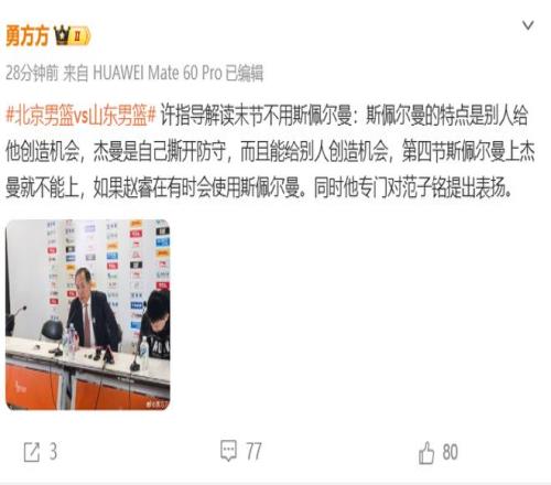 勇方方則表示:有倆事我不是很理解,第四節(jié)連續(xù)丟籃板球的時(shí)候,為啥上了套小陣容?全場(chǎng)最準(zhǔn)三分6中4的斯佩爾曼為啥末節(jié)一分鐘不上呢?