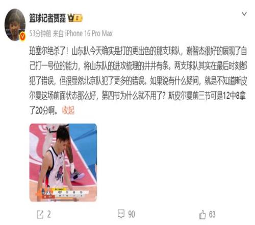 賈磊認(rèn)為:山東隊(duì)今天確實(shí)是打的更出色的那支球隊(duì),謝智杰很好的展現(xiàn)了自己打一號(hào)位的能力,將山東隊(duì)的進(jìn)攻梳理的井井有條。兩支球隊(duì)其實(shí)在最后時(shí)刻都犯了錯(cuò)誤,但很顯然北京隊(duì)犯了更多的錯(cuò)誤。如果說有什么疑問,就是不知道斯皮爾曼這場(chǎng)前面狀態(tài)那么好,第四節(jié)為什么就不用了?斯皮爾曼前三節(jié)可是12中8拿了20分啊。