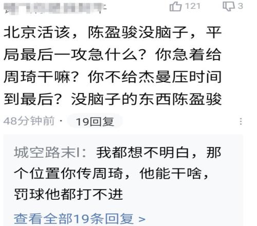 這一球至關(guān)重要,沒有克里斯,就沒有珀賽爾的最后絕殺,換句話來說,北京主要就是輸在了第四節(jié)最后關(guān)頭陳盈駿和周琦的連線失誤上,賽后有不少球迷都將北京輸球的大鍋都扣給了陳盈駿和周琦,情緒激動(dòng)的球迷直接怒斥:北京活該,陳盈駿沒腦子,平局最后一攻急什么?著急給周琦干嘛?