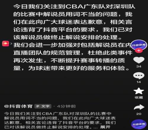 憤怒的廣東球迷開始投訴,于是抖音官方趕緊公開道歉,宣布解雇這個(gè)解說,并且向廣大球迷致歉。