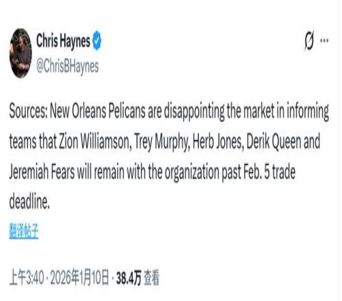 北京時間1月10日,據(jù)名記Haynes報道,新奧爾良鵜鶘隊已向聯(lián)盟其他球隊明確表示,在2月6日交易截止日(北京時間)前,無意交易錫安-威廉姆森、特雷-墨菲、赫伯特-瓊斯、德里克-奎因和耶利米-費爾斯。