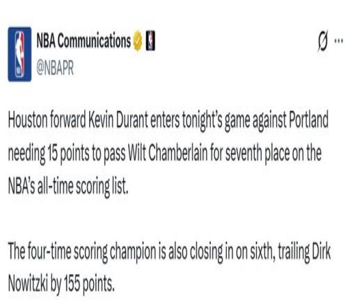 本周四,火箭隊以102-103惜敗開拓者,杜蘭特砍下37分,生涯總得分來到31405分,再得15分就將超越張伯倫。張伯倫在1959至1973年的職業生涯中共斬獲31419分,曾是聯盟歷史得分王,直至1984年被賈巴爾超越。不出意外的話,火箭今日在摩達中心再度對陣開拓者的比賽,杜蘭特就將獨享歷史得分榜第七的位置。