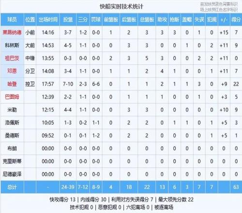 快船:哈登22分1板2助、科林斯9分3板、米勒9分3板、萊昂納德7分3板3助3斷、鄧恩7分2板4助、巴圖姆5分1板1助、洛佩斯3分2板、桑德斯1分2板、祖巴茨5板3助