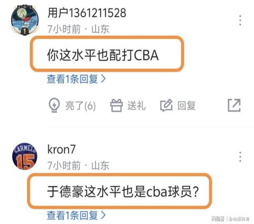 于德豪持續糟糕的表現,也遭到網友吐槽。“如果不是秋膘帶著你 你的水平不配打cba”;“你這水平也配打CBA?”;“于德豪這水平也是cba球員?”;“北京首鋼核心-于德豪”;“聽說還是國家隊隊員”;“今天差點就要拿到北京戶口了,奈何外援大哥不同意”;“這貨有能力打CBA么,山東那么缺人么”;“差點最后輸他身上”……