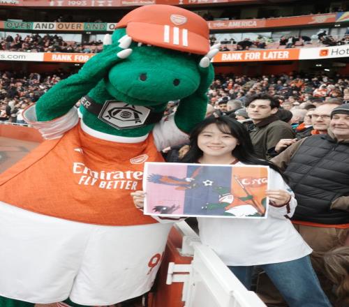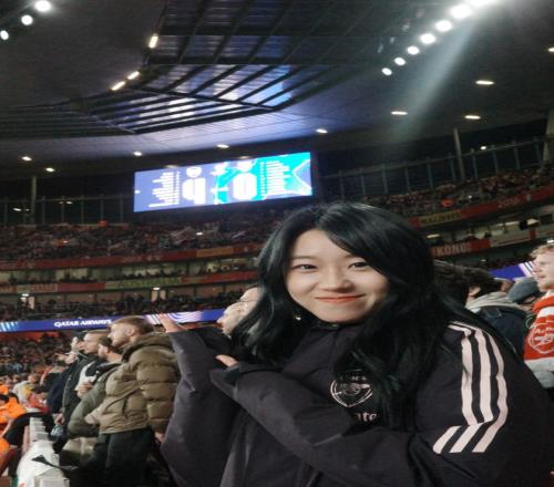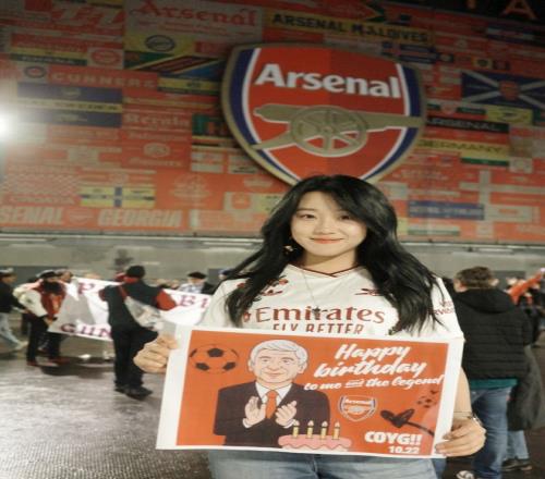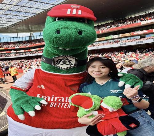 A:我叫菲菲,是一名95后女球迷,出生在山東濟(jì)南。我的俱樂部主隊(duì)是阿森納,因?yàn)楝F(xiàn)在在倫敦工作,所以每到世界杯或大賽,我也會選擇支持英格蘭。我和足球的最初記憶其實(shí)非常生活化。小時(shí)候的夏夜,會跟著爸爸去濟(jì)南的燒烤攤看世界杯,老電視、小板凳,還有一群陌生卻因?yàn)樽闱蜓杆贌峤j(luò)起來的大人們?,F(xiàn)在回想起來,那些畫面都還是特別珍貴的記憶。中學(xué)時(shí),班里大部分同學(xué)都是皇馬和C羅的球迷,每天都能聽到朋友們聊足球,我們也會一起去看山東泰山的主場比賽。上大學(xué)之后,我更多是看世界杯和歐洲杯,不太會熬夜追聯(lián)賽。直到去英國讀書,才和室友們一起關(guān)注英超的各種動向。但真正的轉(zhuǎn)折點(diǎn),是去年正式來到倫敦工作,我才開始盡量一場不落地走進(jìn)球場支持自己的主隊(duì)。截至目前,我已經(jīng)在現(xiàn)場看過45場比賽,這種連接是過去十幾年隔著屏幕無法比擬的。我想我這輩子都會是阿森納球迷了。