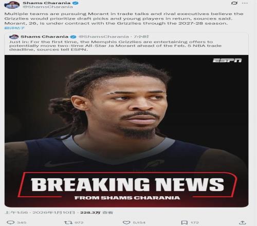 北京時間1月10日凌晨,NBA名記Shams報道,灰熊準備在交易截止日(2月6日)前送走莫蘭特,首次開始聆聽莫蘭特的報價?;倚軟Q定圍繞小賈倫-杰克遜打造陣容,多支球隊正在追求莫蘭特,灰熊的要價是潛力新星和首輪簽。