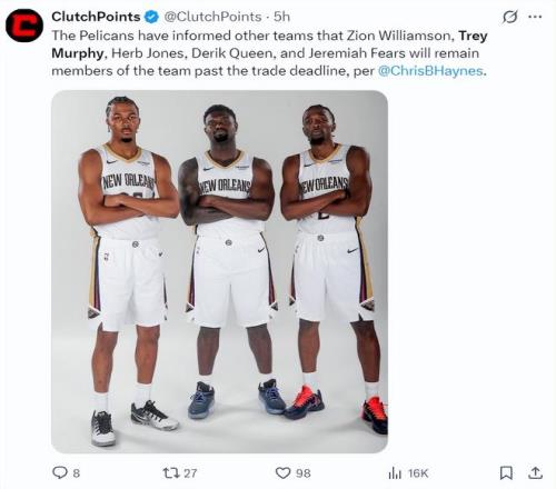 賽前傳來了一個消息,根據《雅虎體育》記者克里斯-海恩斯的消息,鵜鶘隊已經告知聯盟各隊,在交易截止日前:錫安、墨菲、奎因、費爾斯、赫伯特-瓊斯五人都會留在鵜鶘陣容中,這5人之外的球員才能被交易。
