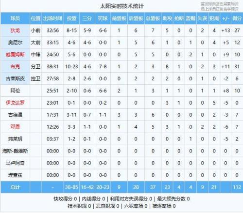 下半場回來,尼克斯的命中率下滑明顯,太陽在第三節(jié)末段轟出一波14-0的攻勢將分差拉開到兩位數(shù),末節(jié)尼克斯發(fā)起了兇猛的反撲,并且將太陽的進攻限制得很好,比賽懸念打到最后,關(guān)鍵時刻太陽連拿五分,伊戈達羅雖然兩罰全丟給對手留下機會,但阿倫的致命防守直接拿回球權(quán),阿努諾比再獲三罰也無濟于事,最終太陽112-107力克尼克斯迎來連勝。