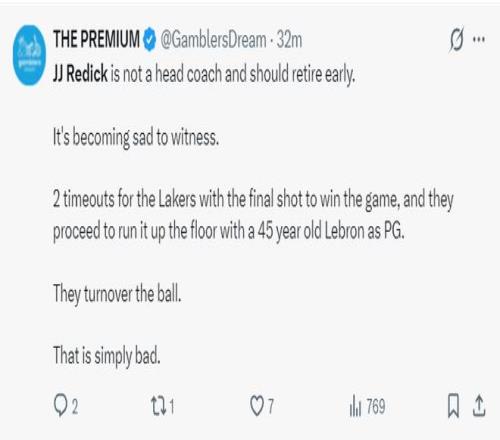 湖媒:雷迪克根本沒有請求暫停,這才是我對湖人失去信心的原因之一。這場比賽真的糟透了。
