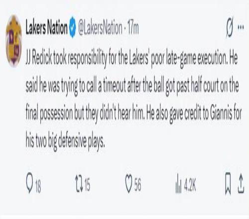 湖人101-105逆轉雄鹿失敗,這場比賽湖人一度落后雄鹿12分,末節在詹姆斯的爆發下完成反超,可進入決勝時刻湖人攻防兩端都斷電了,尤其是16.2秒東契奇送三分犯規后,雷迪克手握2個暫停都不叫暫停,結果導致詹姆斯被揚尼斯搶斷葬送比賽,詹姆斯被推上風口浪尖。