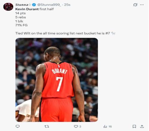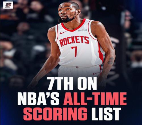 這場比賽杜蘭特的得分爆發力沒有上一場那么爆炸,因為阿門也有一個不錯的發揮。在第二節還剩1分54秒杜蘭特后仰命中拿到第14分,他生涯總得分追平了張伯倫升至歷史第七位。
