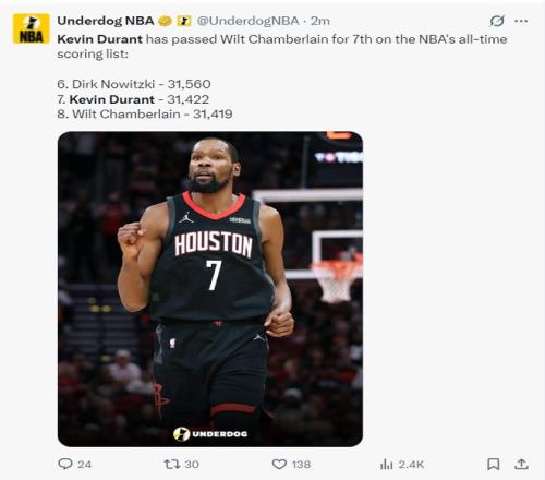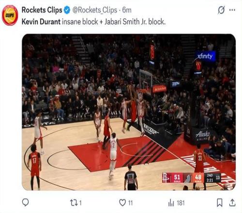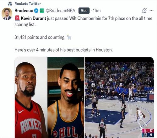 火箭記者Bradeaux寫道:杜蘭特完成31421分,而且他的得分還在提升,超越張伯倫后他會超越更多人,GOAT。