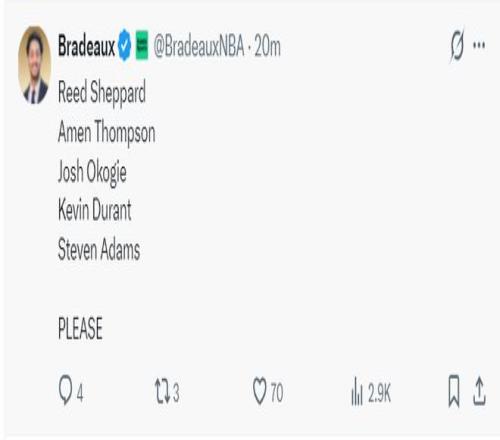 火箭記者Bradeaux:決勝時刻火箭應該用謝潑德、阿門、奧科吉、杜蘭特、亞當斯。