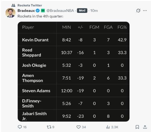 這場比賽火箭的第一罪人小賈巴里-史密斯,末節8中0+三分7中0,決勝時刻三個大空位三分打鐵,全場比賽41分鐘,21中6+三分10中0+罰球2中1拿13分8籃板1助攻2搶斷3蓋帽1失誤,真實命中率29.7%,正負值-19。