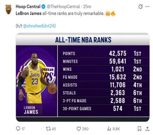 全場比賽詹姆斯21中10+三分7中2,拿到26分10助攻9籃板3搶斷,命中率47.6%。美媒HC曬出勒布朗八項數據再贊偉大,這八項數據里勒布朗有三項是第一,
