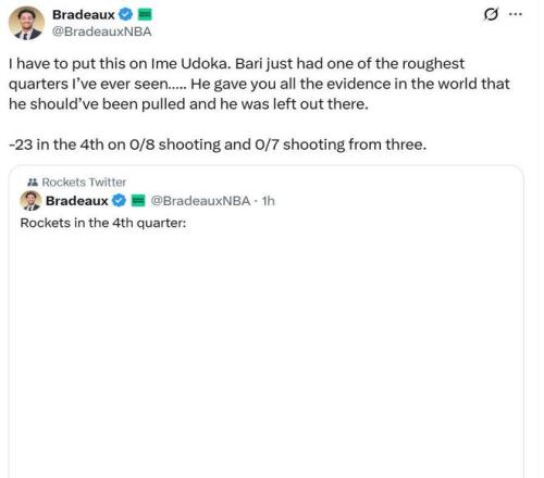 賽后連火箭媒體人Bradeaux都感到不解:“我這一次不得不把比賽失利的責任歸咎于烏度卡,小賈打出了生涯最掙扎的一節比賽,他已經用各種方式證明他需要被換下場,結果烏度卡依舊將其留在場上。”
