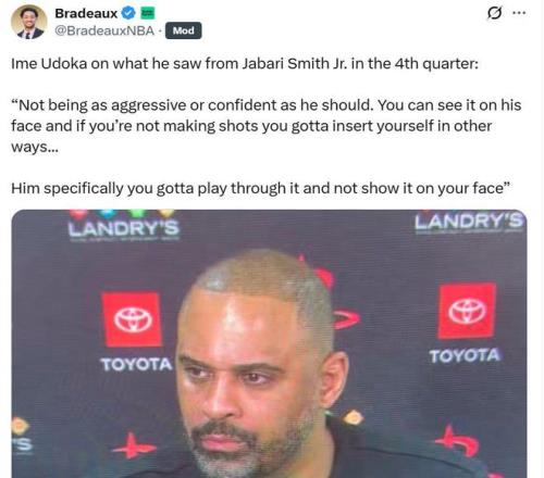 賽后還公開點名批評小賈:“他沒有侵略性,也不夠自信,一切都表現在臉上,如果你無法命中投籃,就需要想其他辦法參與比賽,尤其是對他來說,必須硬著頭皮挺過去,而不是表現在臉上。”