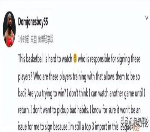 北京時間1月10日,前吉林男籃名宿外援瓊斯更新社媒發文:“這場球太難看了。誰負責簽的這些球員?誰把他們訓練得這么差?你們想贏嗎?在我回CBA之前,我不會再看這樣的比賽了,我不想養成壞習慣。我確信簽約對我來說不是問題,因為我仍然聯盟前3名。”