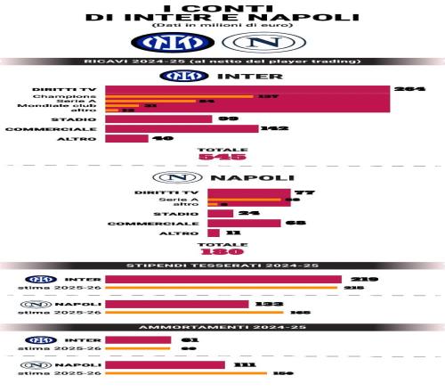 作為意甲冠軍,那不勒斯從意甲聯盟獲得的收入,僅為歐聯亞軍國際米蘭從歐足聯那里所得的一半。這正是兩隊明日對決背后,經濟實力存在差距的原因之一。國際米蘭擁有全球影響力,上賽季更創下了意大利足壇的收入紀錄——不含球員交易收入達5.45億歐元,其中超三分之一來自球隊闖入歐冠決賽的出色表現(盡管最終不敵巴黎圣日耳曼)。