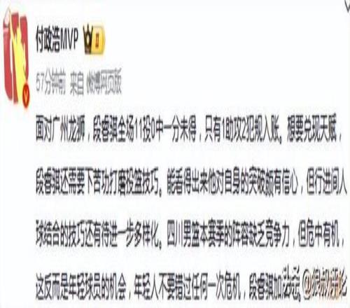 媒體人付政浩發文點評:面對廣州龍獅,段睿騏全場11投0中一分未得,只有1助攻2犯規入賬。想要兌現天賦,段睿騏還需要下苦功打磨投籃技巧。能看得出來他對自身的突破頗有信心,但行進間人球結合的技巧還有待進一步多樣化。