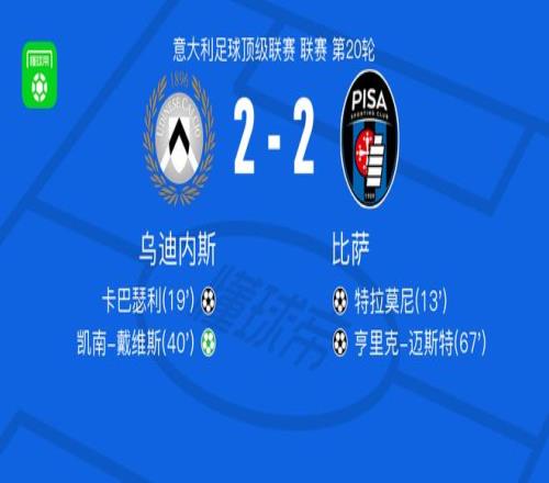 北京時間1月10日意大利足球頂級聯(lián)賽 聯(lián)賽 第20輪,烏迪內(nèi)斯主場對陣比薩。烏迪內(nèi)斯卡巴瑟利破門,凱南-戴維斯破門。比薩特拉莫尼破門,亨里克-邁斯特破門。最終比分烏迪內(nèi)斯 2-2 比薩。
