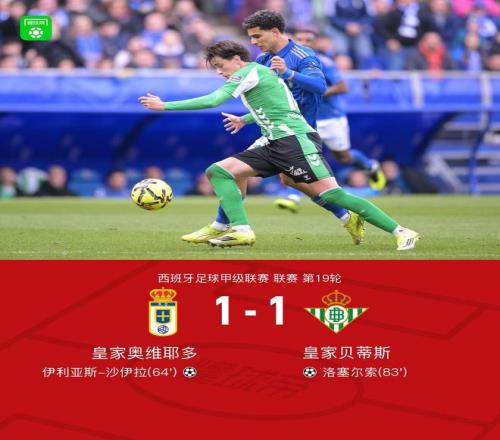 北京時間1月10日西班牙足球甲級聯(lián)賽 聯(lián)賽 第19輪,皇家奧維耶多主場對陣皇家貝蒂斯。下半場沙伊拉禁區(qū)外貼地斬,之后安東尼傳中,洛塞爾索頭球破門。最終比分皇家奧維耶多1-1皇家貝蒂斯。