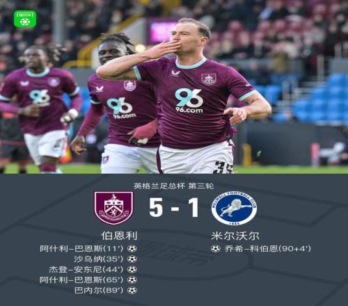 北京時間1月10日,英格蘭足總杯第三輪展開較量,伯恩利迎戰米爾沃爾。比賽伊始,布魯恩-拉森送出助攻,阿什利-巴恩斯率先破門,為球隊取得領先。隨后埃克達爾精準傳球,沙烏納接球后攻門得手,進一步擴大優勢。臨近上半場結束,布魯恩-拉森再次完成助攻,杰登-安東尼射門命中,將比分繼續改寫。易邊再戰,阿什利-巴恩斯把握機會再入一球,完成個人本場比賽第二次破門。之后巴內爾抓住戰機,冷靜施射建功,幫助球隊鞏固領先局面。比賽進入尾聲階段,rafiq lamptey送出關鍵傳球,喬希-科伯恩推射得分,為對手追回一球。最終全場結束,伯恩利以5比1戰勝米爾沃爾,順利晉級下一輪。