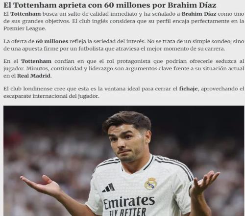 熱刺希望立即提升球隊實力,已將卜拉欣·迪亞斯列為主要目標之一。這家英格蘭俱樂部認為,卜拉欣?迪亞斯的風格非常適合英超聯賽。6000萬歐元的報價體現了他們的認真態度。這并非簡單的試探,而是對一位正處于職業生涯巔峰期的球員發出的堅定信號。